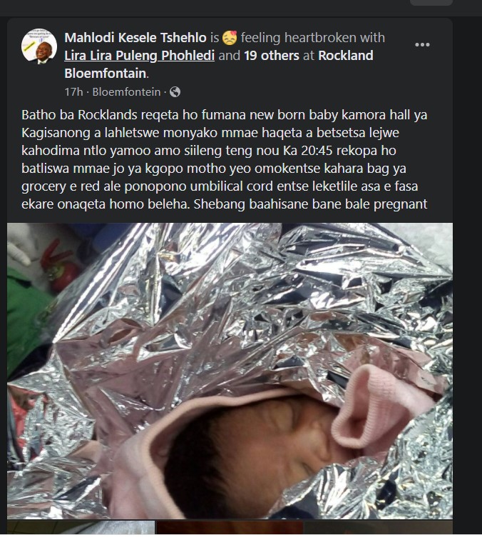 In a post shared on Facebook by Mahlodi Kesele Tshehlo, it appears as that the newborn baby was born on the same day she was dumped.